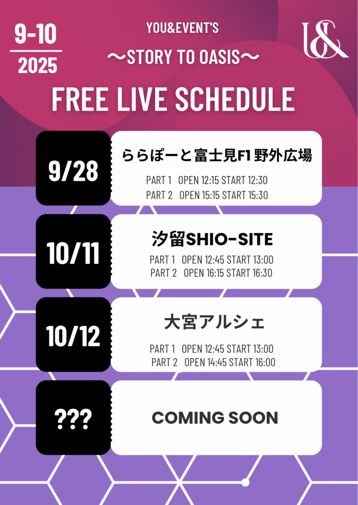 U&pia フリーイベント SCHEDULE 2025/10/11(土) 汐留シオサイト 10/11(土) 📍汐留シオサイト ①部 11:30販売開始 12:30集合 12:45入場 13:00開演 ②部 15:00販売開始 16:00集合 16:15入場 16:30開演 URLをコピーする 報告する